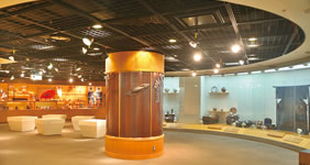 担当された角建具製作所の角(すみ)義行さんは、平成3年に福岡県版「現代の名工」にも選ばれている大川組子の職人です。当時、大川振興センターが大川家具や大川組子をもっと活かしてもらいたいと行っていたプロモーションがアクロスの内装工事業者のアイデアと合致し、お声がかかった角さん。高校時代から建具の道に進むことを決め、しかも一品完結でこの世に二つと同じ製品がないというオリジナリティーにこだわっていた角さんですが、かつてない大きな仕事に最初は戸惑ったそうです。