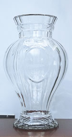 シャンデリアの納品時に、ロブマイヤー社から贈られたクリスタルの花瓶。記念にシャンデリアと福岡県の県花である梅の模様があしらわれています。ホール内のどこかに飾られていますので、ぜひ探してみてください。