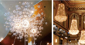 ウィーン学友教会(オーストリア)(写真右)やメトロポリタン歌劇場(ニューヨーク/アメリカ)(写真左)で輝きを放つロブマイヤー社のシャンデリア。