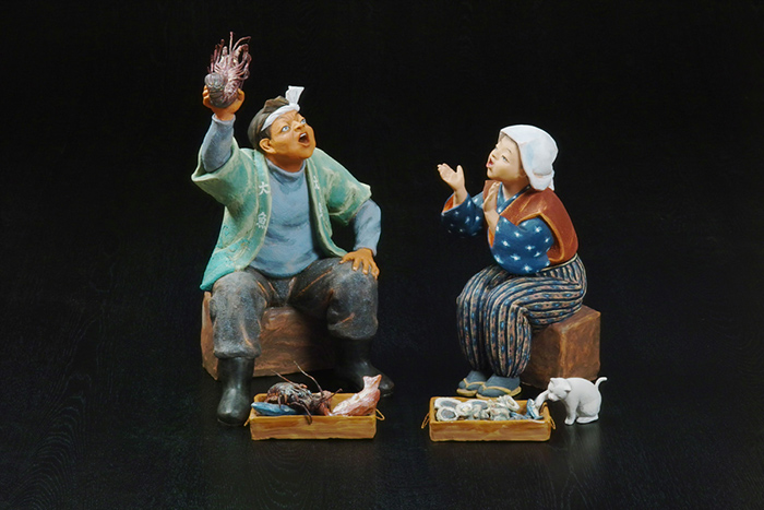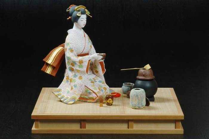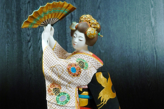 「美人もの」「歌舞伎もの」「能もの」「童もの」「節句もの」などがあります。特に「美人もの」は人気が高く、写実的な表情、肌や着物の柔らかな曲線造形、彩色(さいしき)による美しさは、他の追随を許しません。