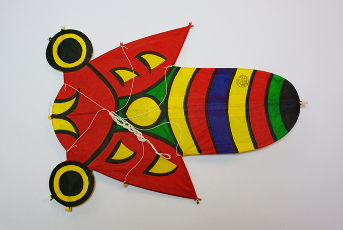 明治末期、戸畑に生まれた「孫次凧」は、竹内孫次氏が作り始めたことにその名を由来します。北九州は海に近く風が強いため、凧上げが盛んな地域で、凧つくりの名人たちが、地域を代表するもの(門司のふぐ、若松のかっぱなど)、孫次凧と同様に製作者の名前を冠したものなど、それぞれの凝った題材や形状で腕を競っていました。孫次凧の主題となっているセミは、「つくつくぼうし」だといわれています。