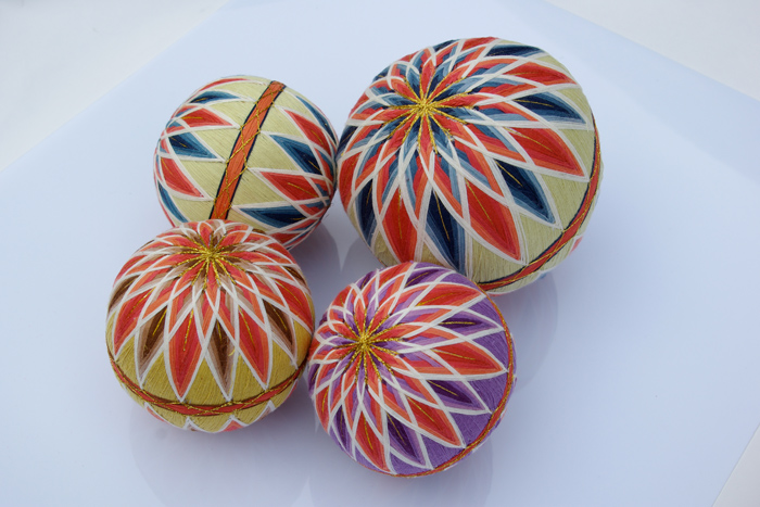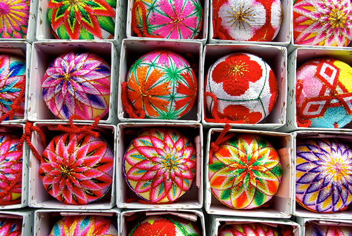 「柳川まり」は、柳川地域に古くから伝わる、女の子の初節句のひな壇飾りである「さげもん」に欠かせない細工として、現代に受け継がれています。作り方は、糸状の木片を丸めたものに、綿と毛糸で成型し、そこに草木染の木綿糸をそれぞれの柄にそった繊細な比率で巻きつけながら刺繍したものです。現在はカラフルな色彩のリリヤン糸も用いられます。