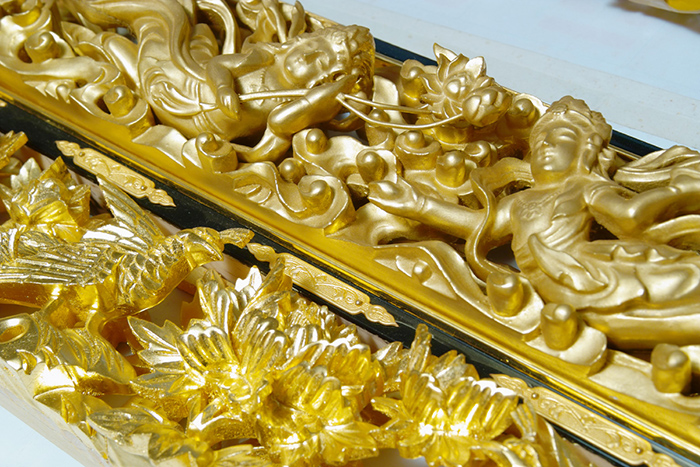 仏壇の製造は完全分業制です。木地師、宮殿師、彫刻師、金具師、蒔絵師などが約80以上の工程をこなします。仏壇の中にある屋根や柱の細やかな部分を作る宮殿師、仏壇上部を飾る鳥や花などの図柄を一枚の板に彫る彫刻師、そして彫刻に箔押し用の漆を塗り、金箔を乗せ重厚な仕上がりにしていく塗師や蒔絵師の工程など、どれひとつとして欠かすことのできない作業がほぼ手作業で行われていきます。日々の鍛錬の中で培われる珠玉の技が、八女福島仏壇を生み出していくのです。