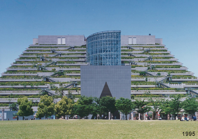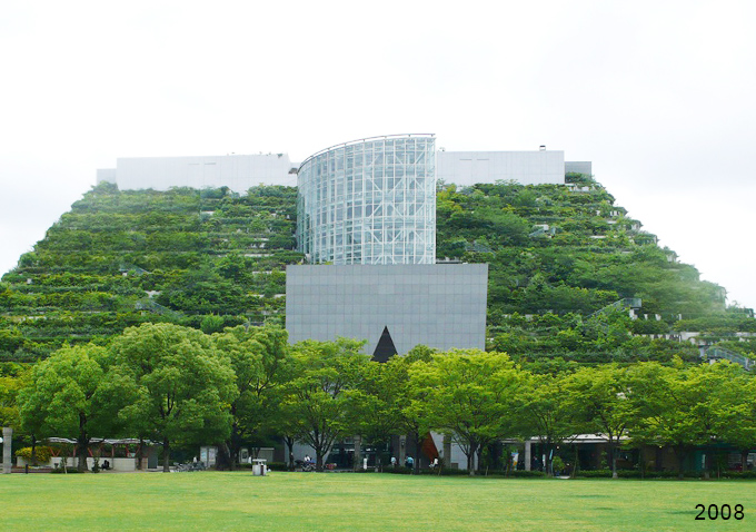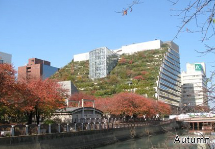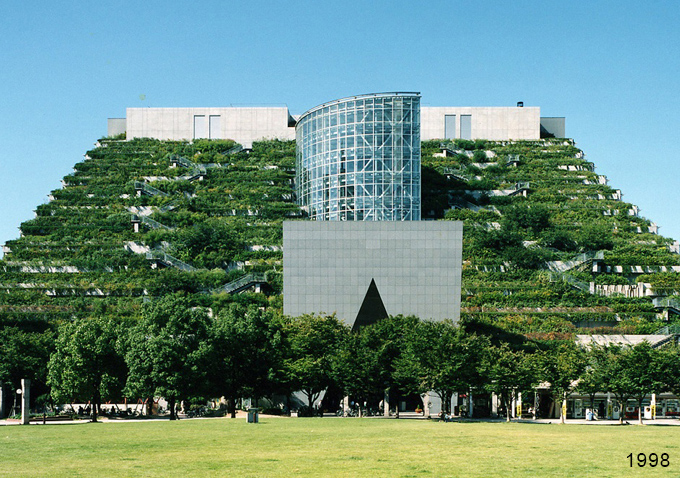 階段状の斜面に緑があふれ、滝が流れる屋上庭園。まるで自然の山のようで「アクロス山」とも呼ばれています。