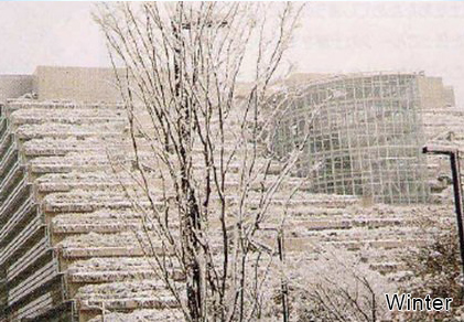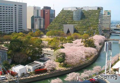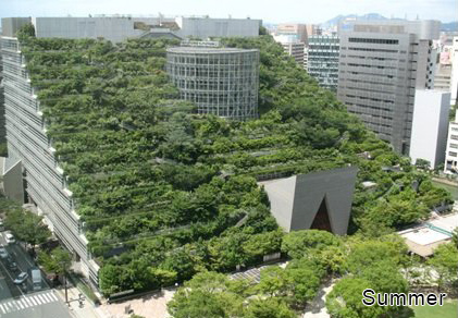 このステップガーデンは天神中央公園の緑が最上階まで連続して見えるように、混植大刈込手法が採用されています。植栽は各階のルーフ植込みと一段低い位置に張り出したミニプランターから構成され、大刈込みを全体におこない、一体化させています。屋上緑化面積は2階部分から14階部分までで約5,400㎡。建築当初は全体で76種、37,000本を植栽しました。その後、補植したり野鳥等によって運ばれた樹種が増え、現在では200種類ほどになっています。九州大学の調査結果によると夜間のステップガーデンにおける冷気流の発生により、ステップガーデンと公園は周辺市街地に比べ低い温度であることが確認されました。2015年にはCNN.comの「世界で最も美しい10のスカイガーデン」に選ばれています。