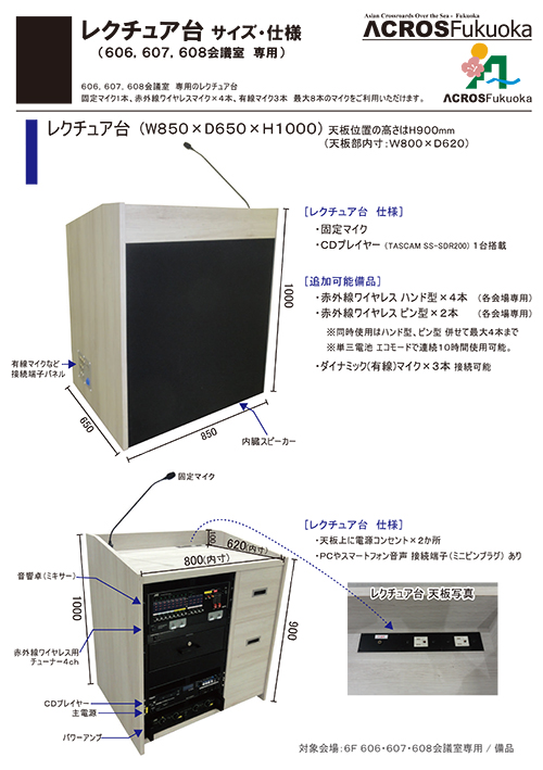 レクチュア台は、606、607、608の各会議室でのみ利用可能。その他の会議室ではポータブルアンプ利用。