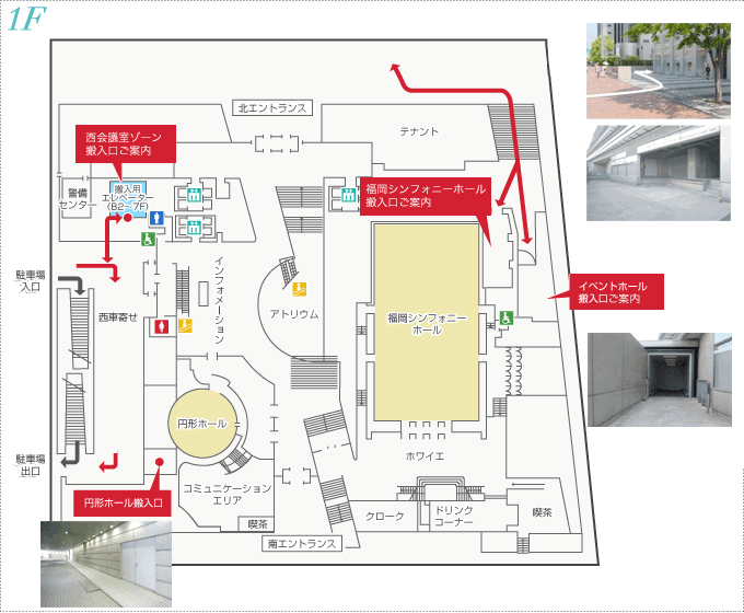 | 料 金 | 最初の1時間 500円 以降30分毎 250円 ※22:30以降翌日7:00までは、1,100円の1泊料金が加算されます。 ※(公財)アクロス福岡が管理する各施設ご利用時の割引きはございません。 【障がい者手帳等をお持ちの方がアクロス福岡をご利用になる場合の駐車場のご案内】 障がい者手帳等(身体障がい者手帳・精神障がい者手帳・療育手帳)(注1)と「施設利用証明書」(注2)を地下3階駐車場管理室にご呈示いただくと、駐車料金を次のとおり割引いたします。 障がい者手帳等をお持ちの方の割引 ・シンフォニーホール、イベントホール、国際会議場、会議室をご利用の場合、3時間の無料券を交付いたします。 ・上記以外の施設をご利用の場合、2時間の無料券を交付いたします。 注1 障がい者手帳等をお持ちでない方の割引はございません。